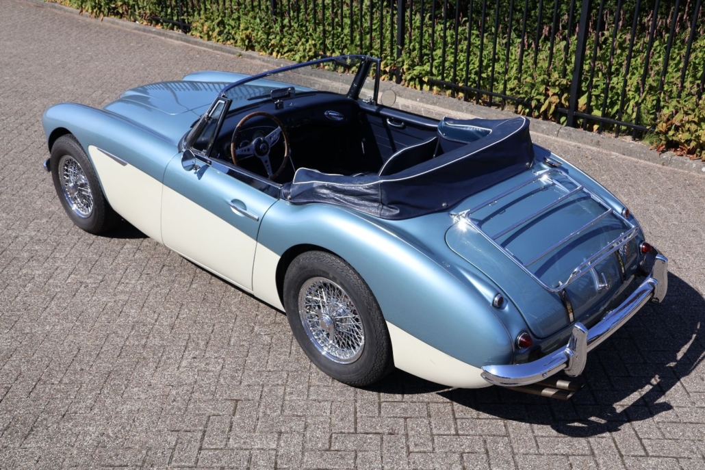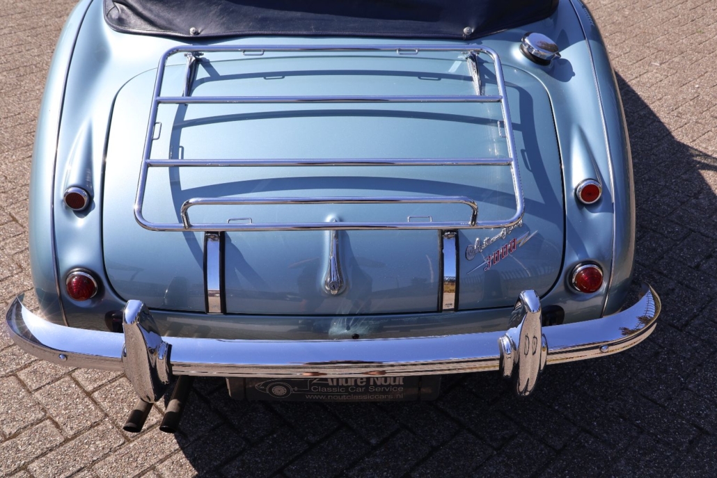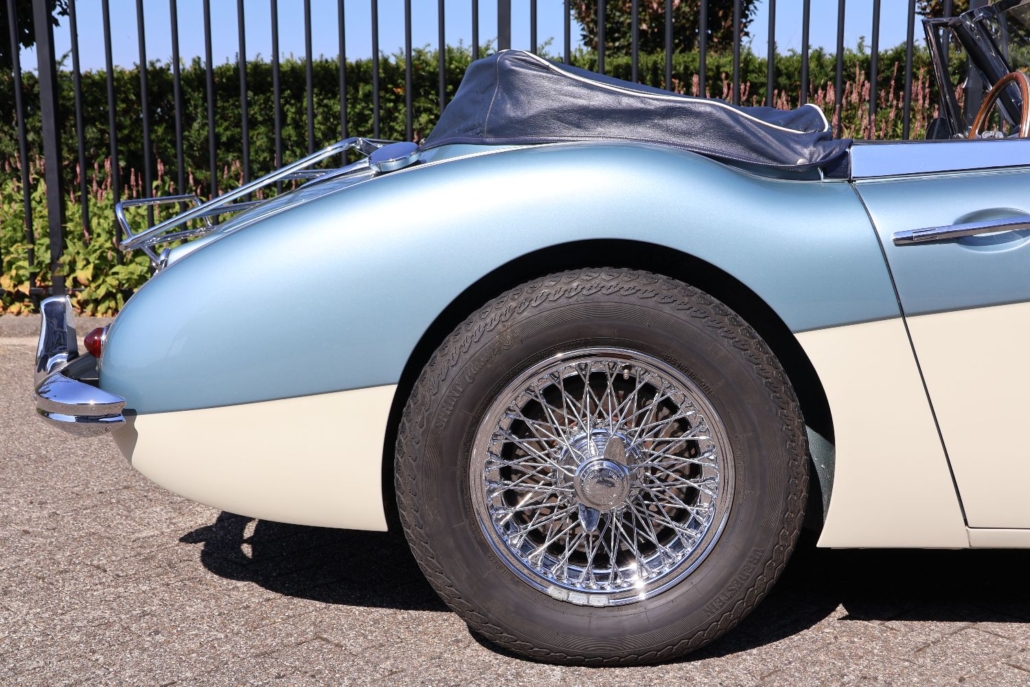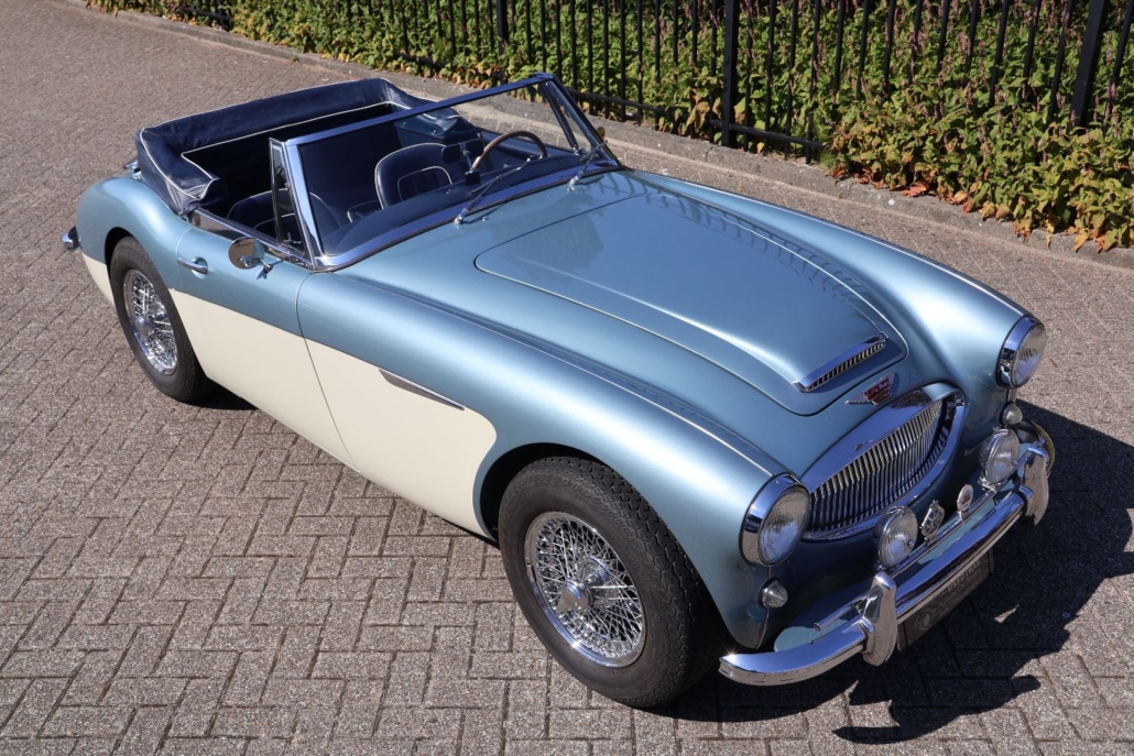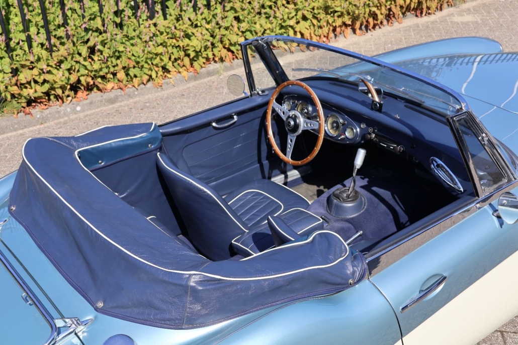 In het verleden is deze Healey volledig body-off gerestaureerd, waarbij veel aandacht is besteed aan het behoud van originele details en vakmanschap. De carrosserie is strak en roestvrij met een glanzende lak die de klassieke lijnen prachtig accentueert. Ook het chroomwerk en authentieke details zijn met zorg hersteld, wat zorgt voor een onberispelijke uitstraling. Uitgevoerd in Healey blue over white, volgens velen de mooiste combinatie op een Austin Healey. De auto is uitgerust met een aantal mooie opties zoals: