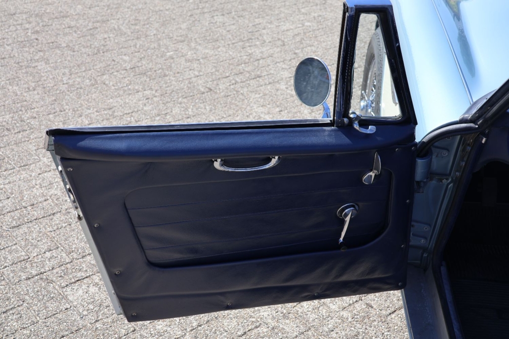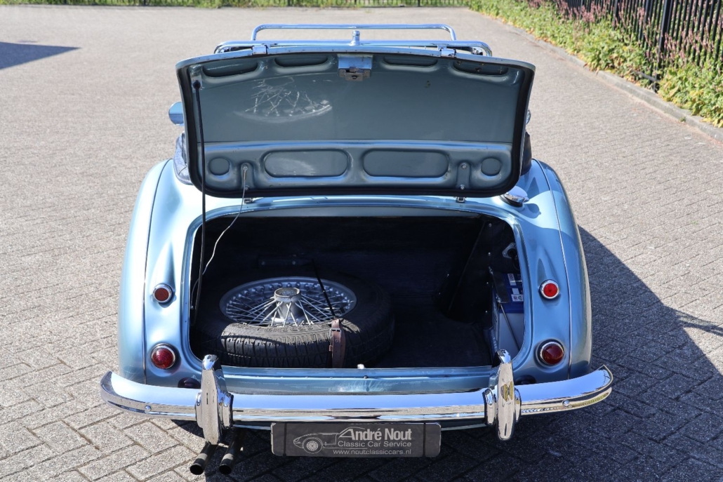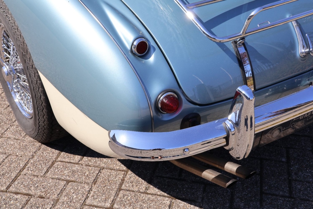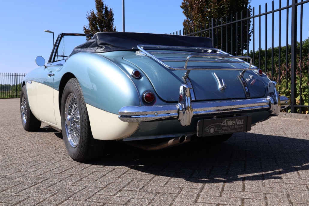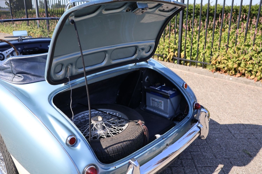 In het verleden is deze Healey volledig body-off gerestaureerd, waarbij veel aandacht is besteed aan het behoud van originele details en vakmanschap. De carrosserie is strak en roestvrij met een glanzende lak die de klassieke lijnen prachtig accentueert. Ook het chroomwerk en authentieke details zijn met zorg hersteld, wat zorgt voor een onberispelijke uitstraling. Uitgevoerd in Healey blue over white, volgens velen de mooiste combinatie op een Austin Healey. De auto is uitgerust met een aantal mooie opties zoals: