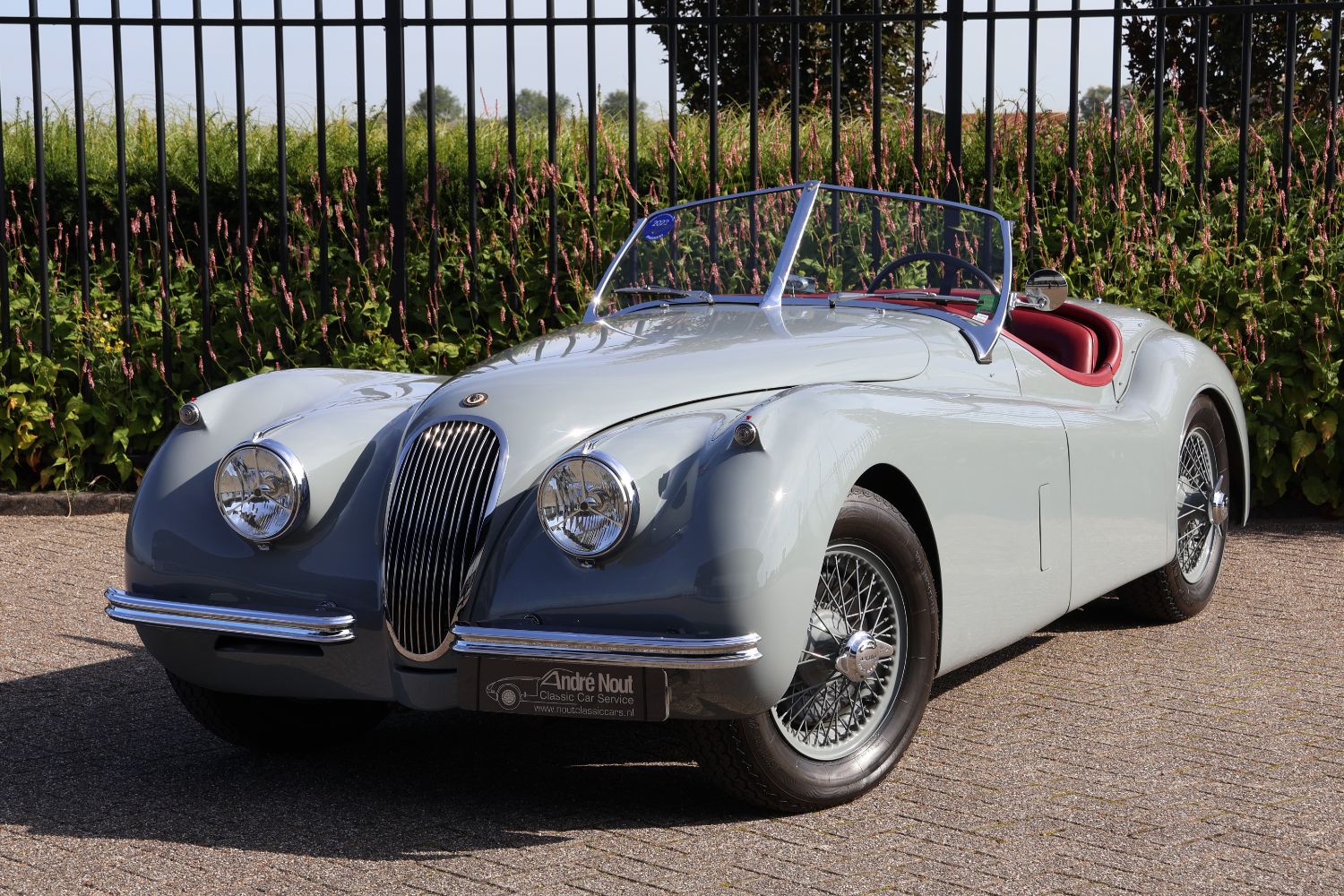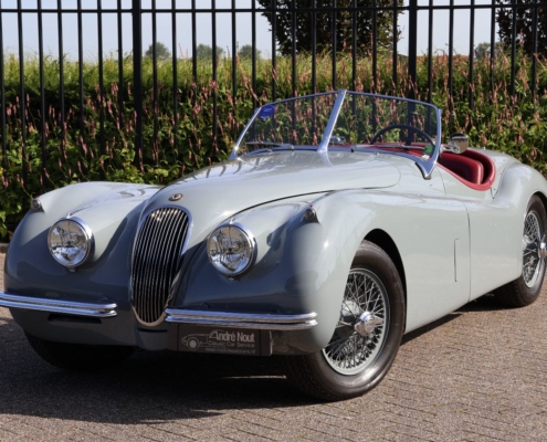We hebben met grote regelmaat klassieke jaguars in de collectie, en reeds vele XK’s mogen verkopen in binnen en buitenland. Ook deze keer kunnen we u namens de eigenaar een bijzonder mooi gerestaureerd exemplaar aanbieden!! Eigenlijk is dit de mooiste van de serie, de XK120 OTS. De lijnen van dit model zijn echt een van de mooiste in de auto industrie en blinken uit door eenvoud en sportiviteit. En wat dacht u van de kleurstelling? Ook die is een van de mooiste die voor dit model leverbaar waren. In 1953, maar tegenwoordig ook weer zeer actueel. Zoals zoveel XK’s is ook dit exemplaar nieuw geleverd naar Amerika, naar de bekende distributeur Hoffman in New York. Dit blijkt uit het heritage certificaat wat bij de auto aanwezig is. Hieruit blijkt tevens dat de kleur, het motornummer, en alle andere nummers nog altijd dezelfde zijn als toen de auto uit de fabriek kwam.