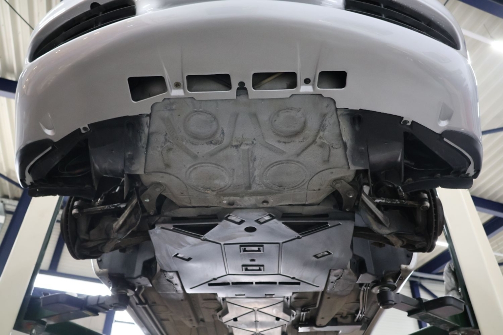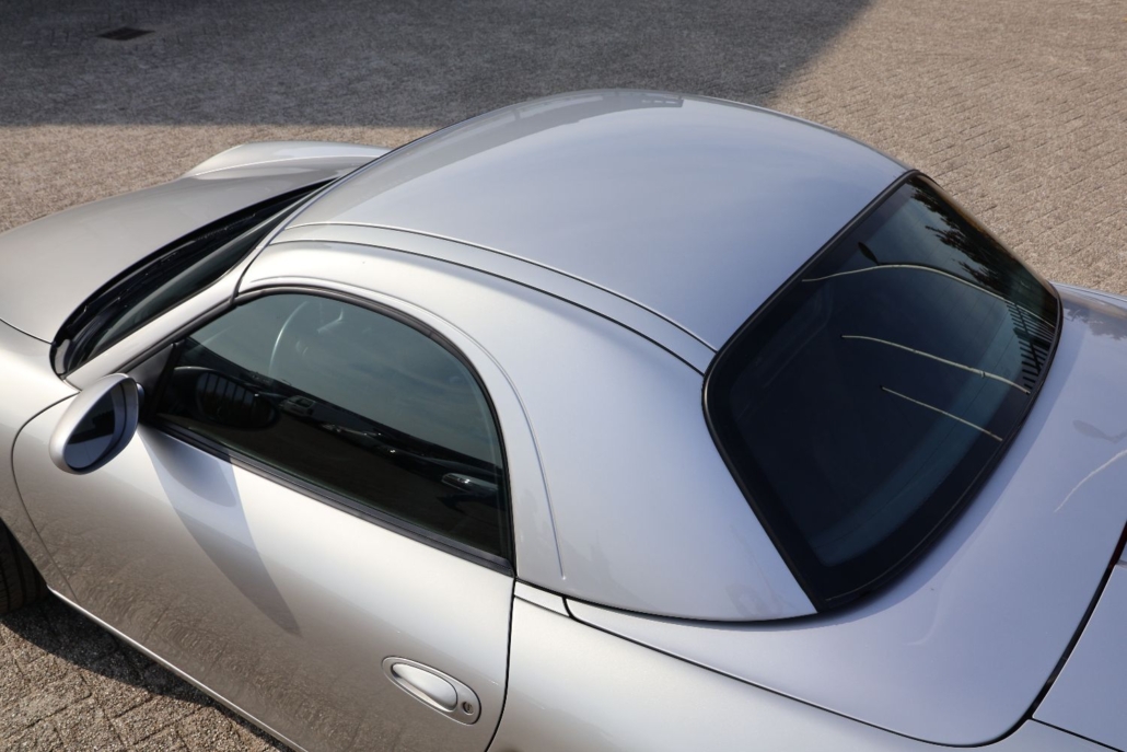 De zilvergrijze metallic lak in combinatie met het zwarte lederen interieur straalt klassieke sportiviteit uit. Dankzij zowel de originele hardtop als de zwarte softtop is de Boxster geschikt voor elk seizoen. De handgeschakelde transmissie versterkt de pure Porsche-rijbeleving – precies zoals het bedoeld is.