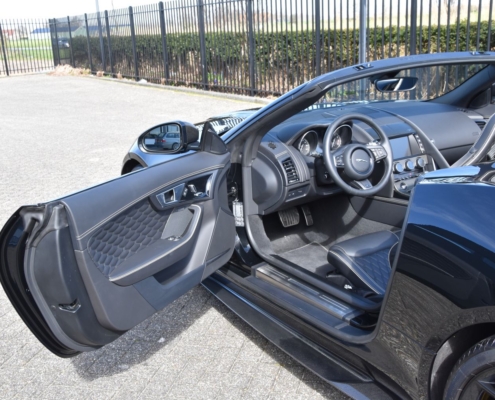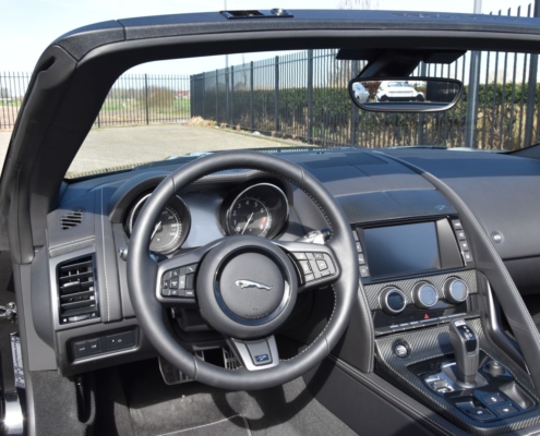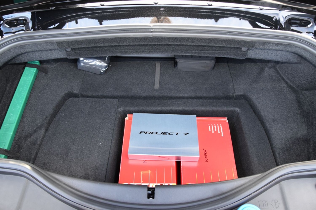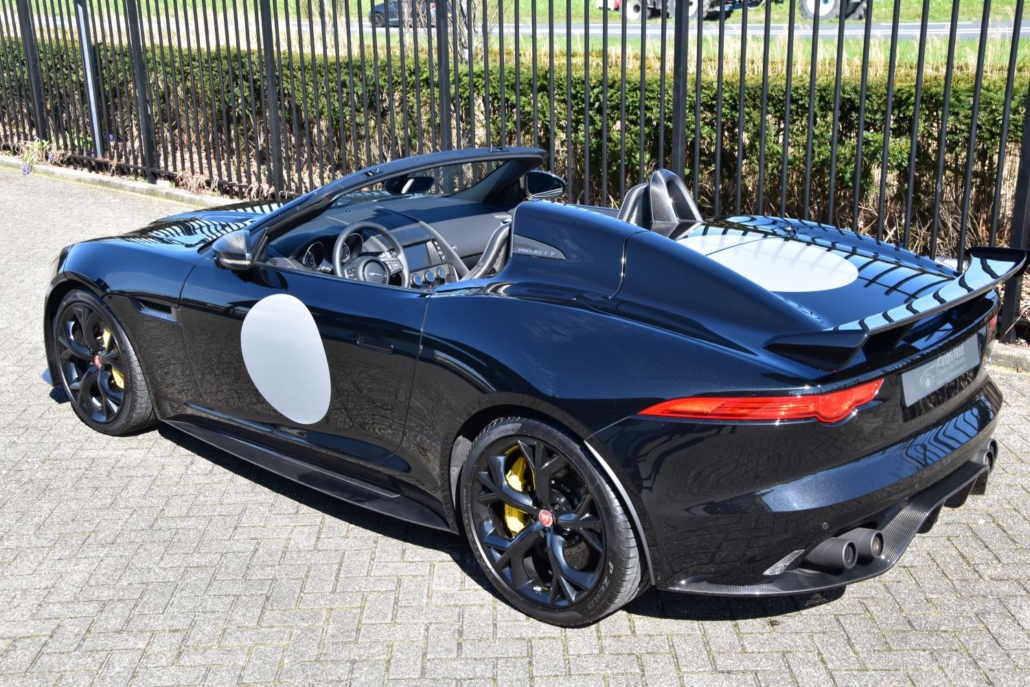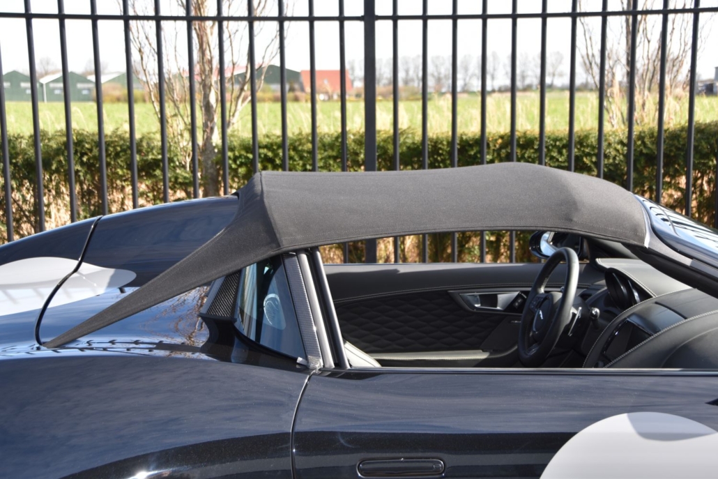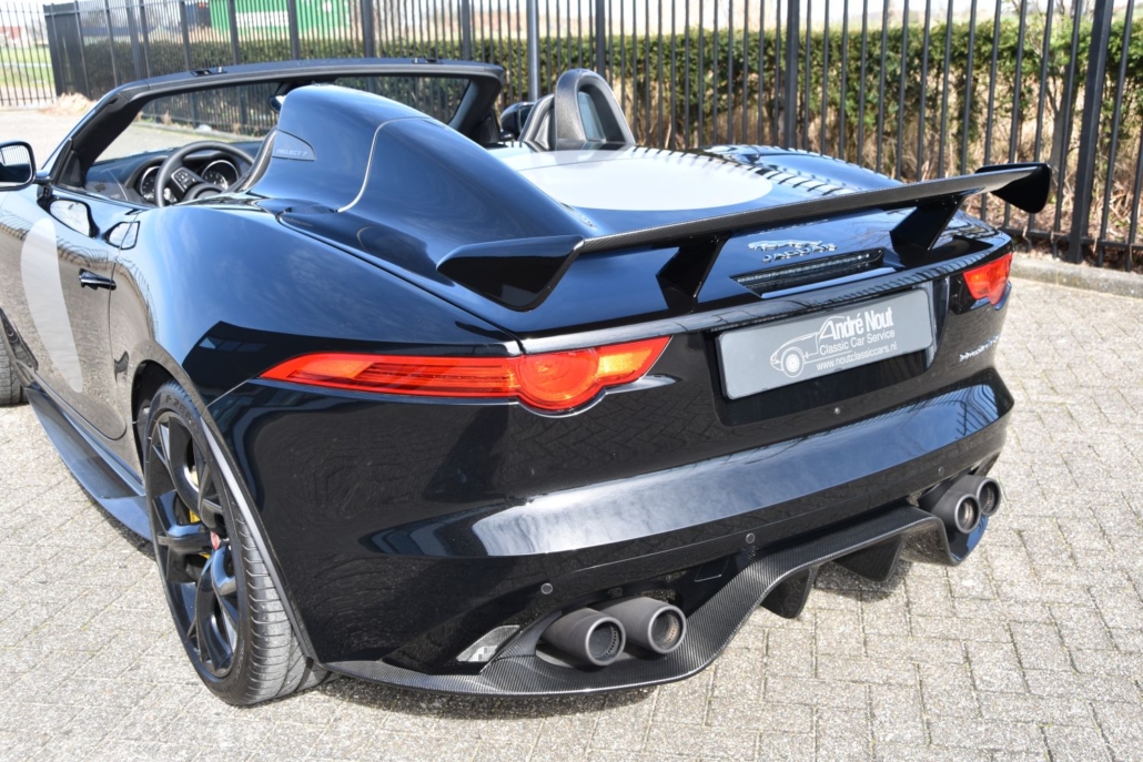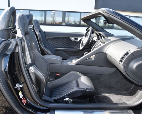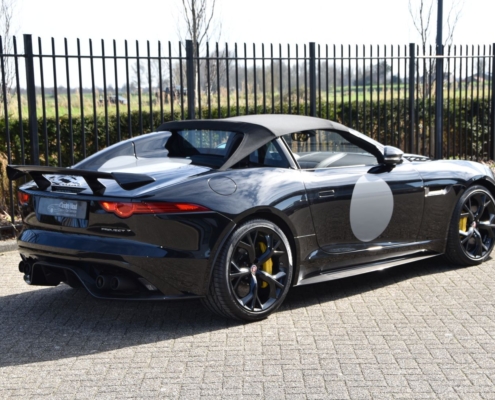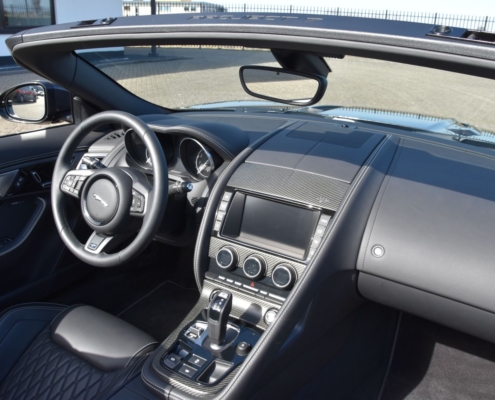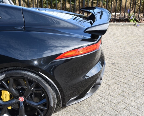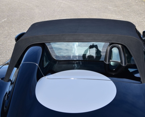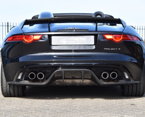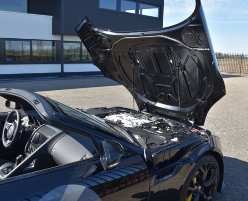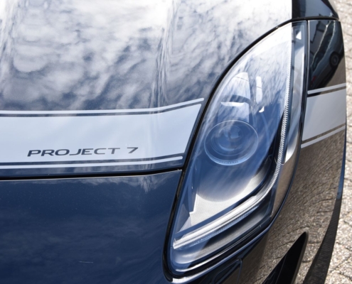This is not just any F-Type! The original 5.0 liter V8 version already has a considerable amount of horsepower as standard, but in the Project 7 this was increased to 575 bhp. The roof was completely omitted and the windshield was lowered with 30 mm. Behind the driver, the distinctive “D-Type” hump was added and the front bumper, spoiler, diffuser and rims were modified. SVO developed a custom tuning for the 8-speed quickshift transmission and the electronic active diff, enabling acceleration from 0-60 mph in 3.9 seconds. The top speed is limited to 300 km/h . The aluminum body weighs 80 kg less than the standard F-Type and the tailgate, bonnet, louvres, power vents in the front wings and mirror caps are made of carbon.