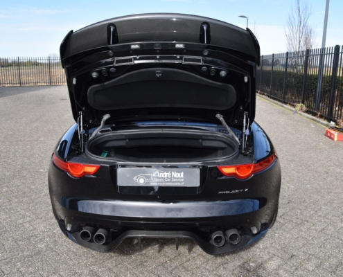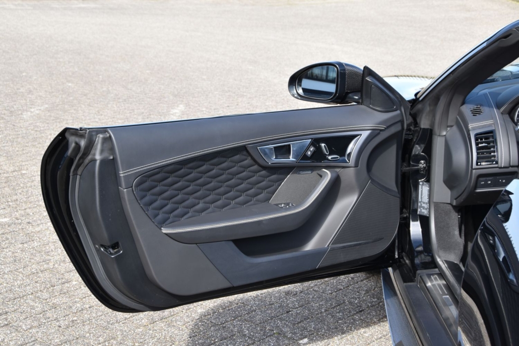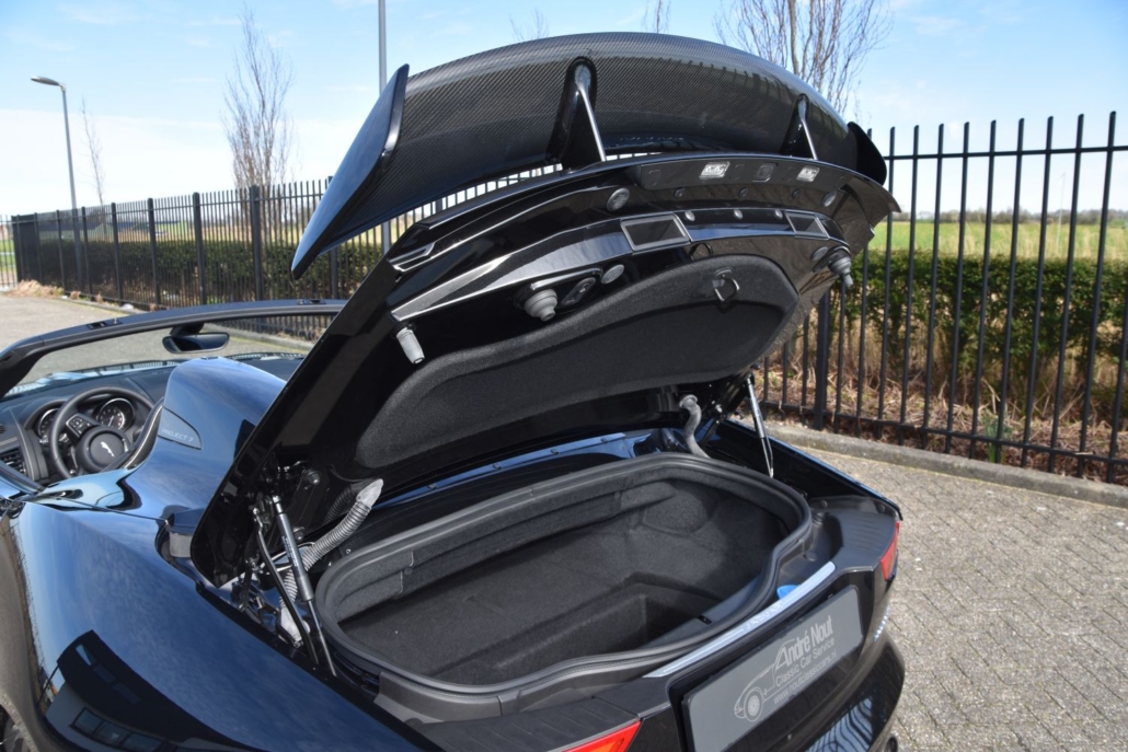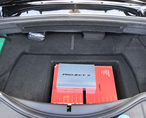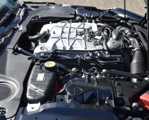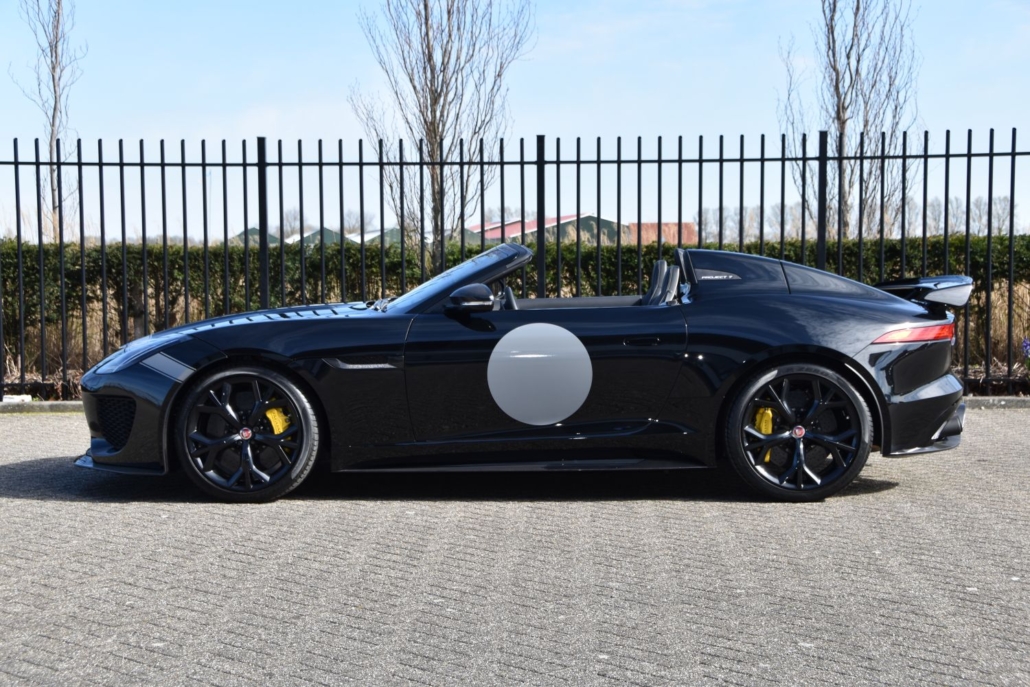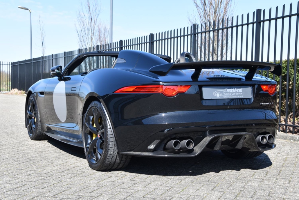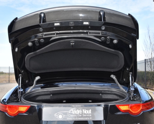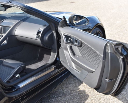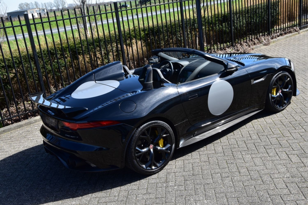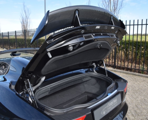 This is not just any F-Type! The original 5.0 liter V8 version already has a considerable amount of horsepower as standard, but in the Project 7 this was increased to 575 bhp. The roof was completely omitted and the windshield was lowered with 30 mm. Behind the driver, the distinctive “D-Type” hump was added and the front bumper, spoiler, diffuser and rims were modified. SVO developed a custom tuning for the 8-speed quickshift transmission and the electronic active diff, enabling acceleration from 0-60 mph in 3.9 seconds. The top speed is limited to 300 km/h . The aluminum body weighs 80 kg less than the standard F-Type and the tailgate, bonnet, louvres, power vents in the front wings and mirror caps are made of carbon.