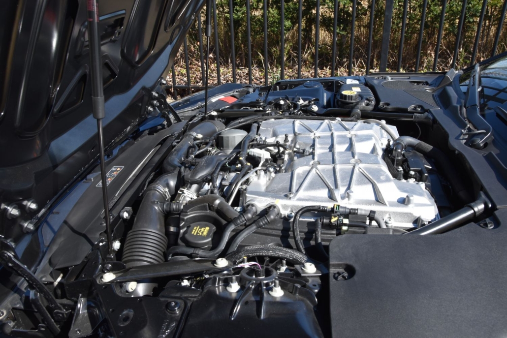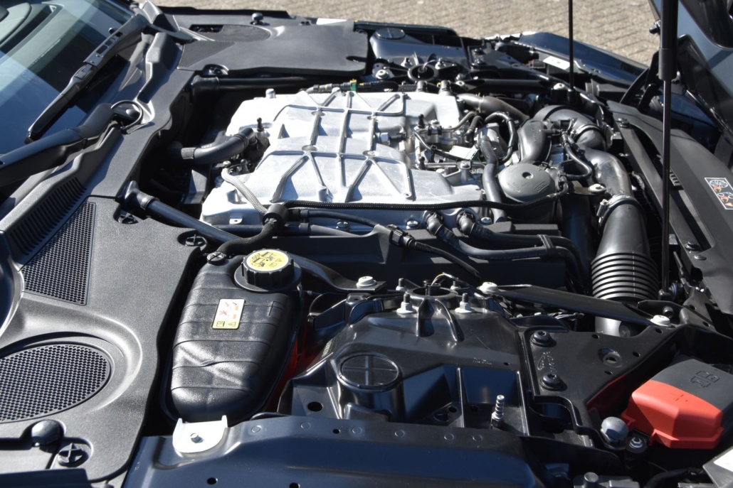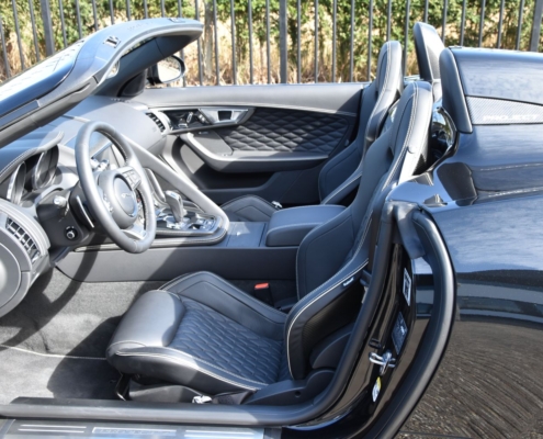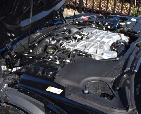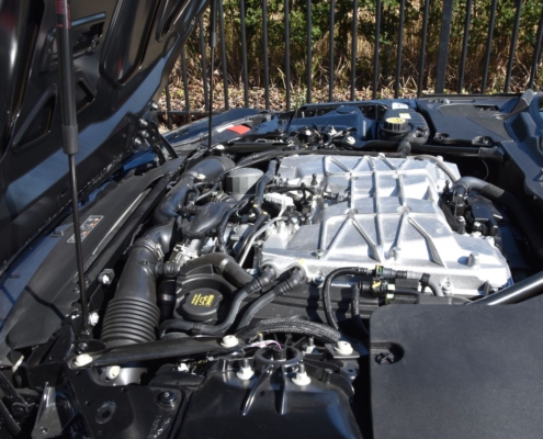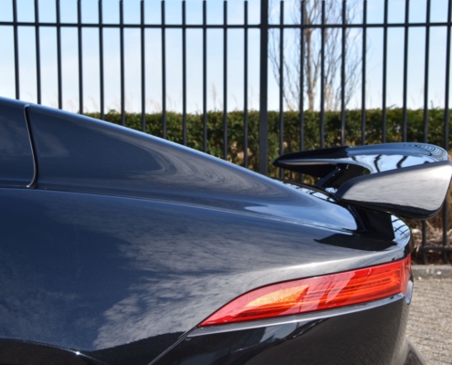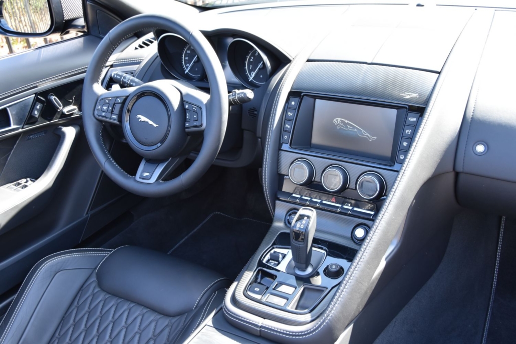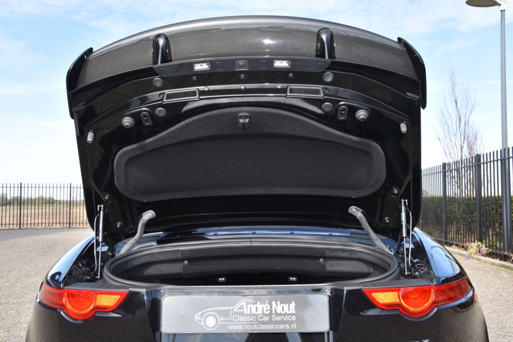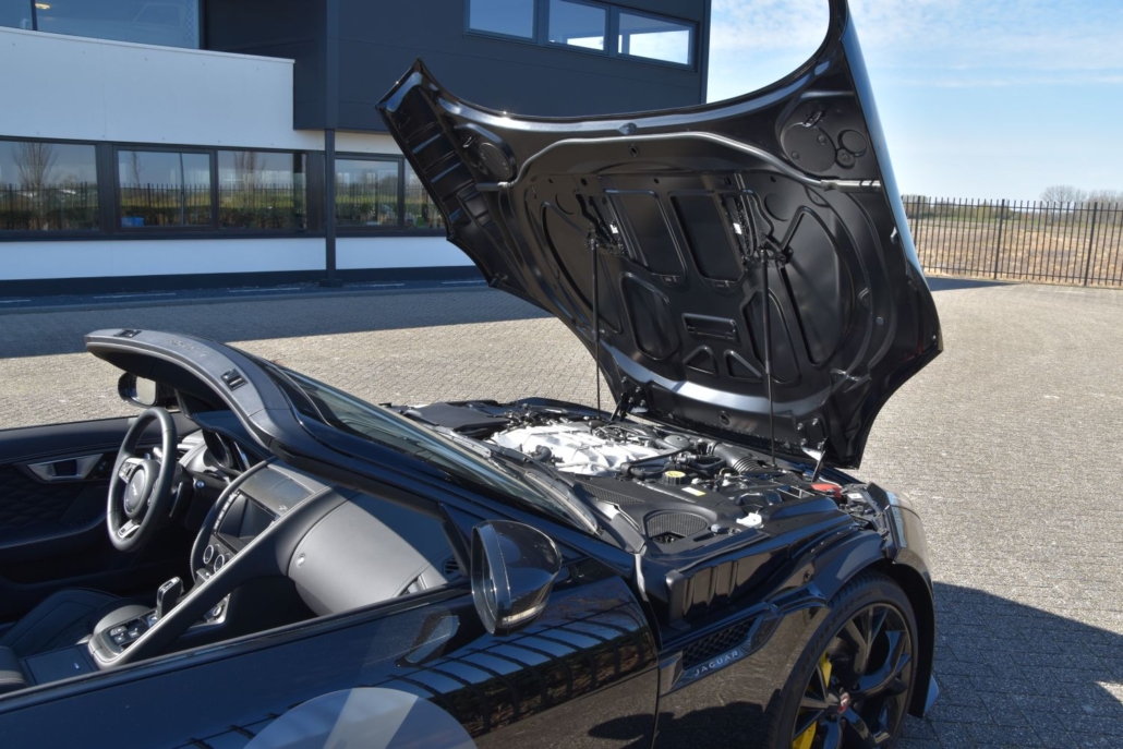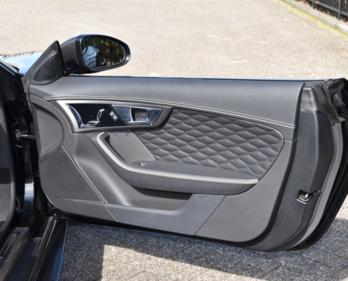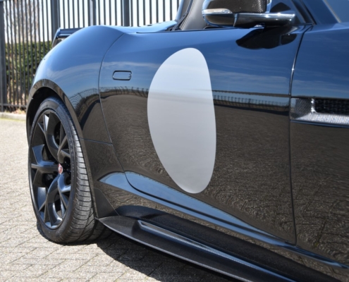 This is not just any F-Type! The original 5.0 liter V8 version already has a considerable amount of horsepower as standard, but in the Project 7 this was increased to 575 bhp. The roof was completely omitted and the windshield was lowered with 30 mm. Behind the driver, the distinctive “D-Type” hump was added and the front bumper, spoiler, diffuser and rims were modified. SVO developed a custom tuning for the 8-speed quickshift transmission and the electronic active diff, enabling acceleration from 0-60 mph in 3.9 seconds. The top speed is limited to 300 km/h . The aluminum body weighs 80 kg less than the standard F-Type and the tailgate, bonnet, louvres, power vents in the front wings and mirror caps are made of carbon.