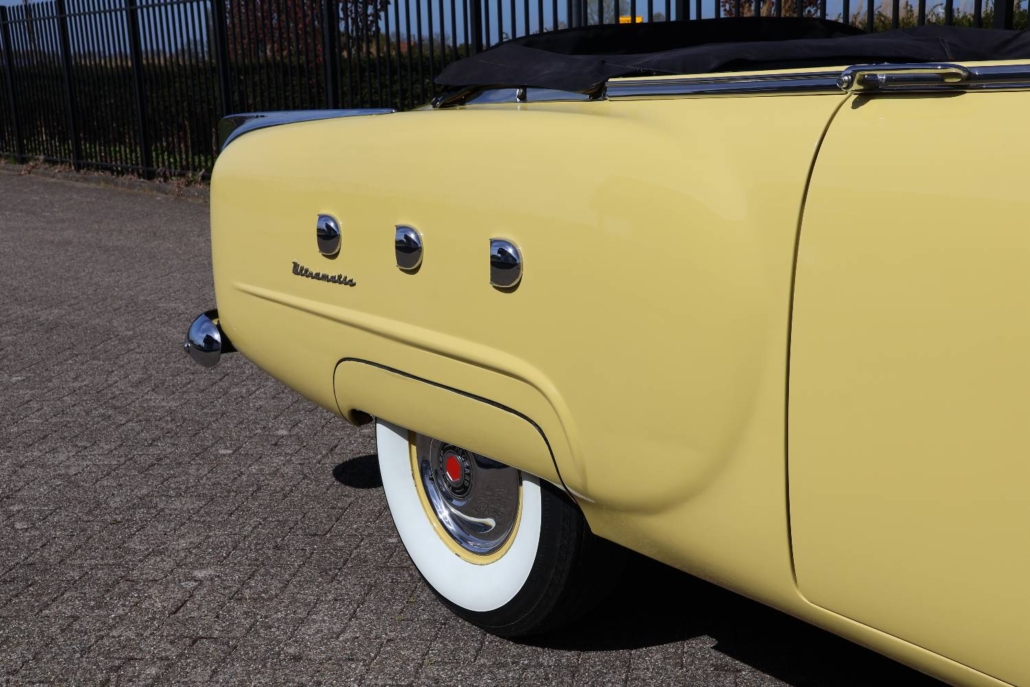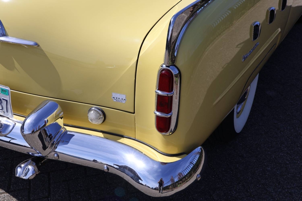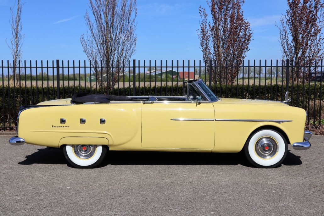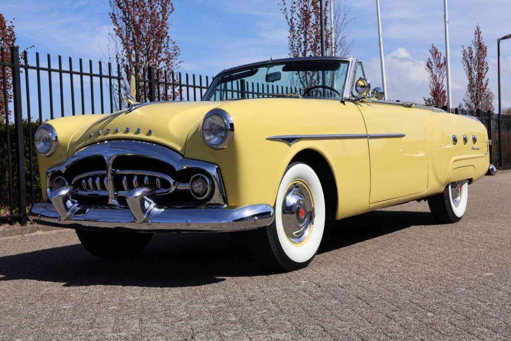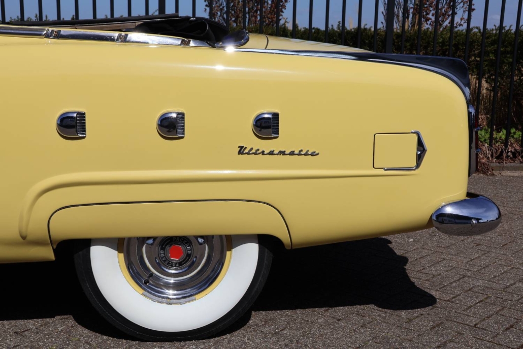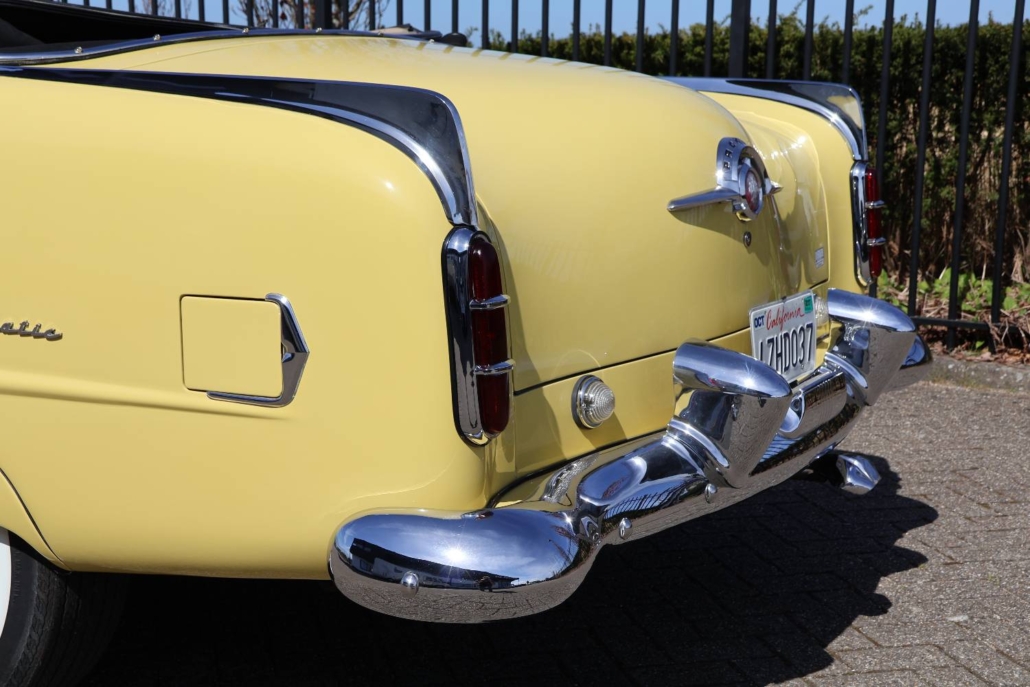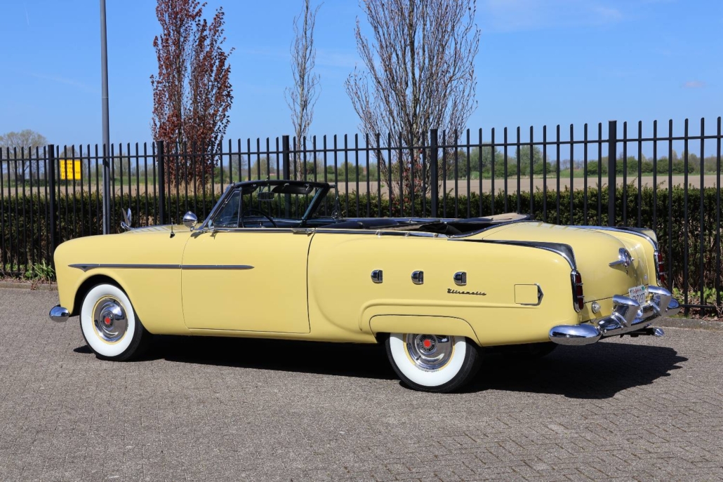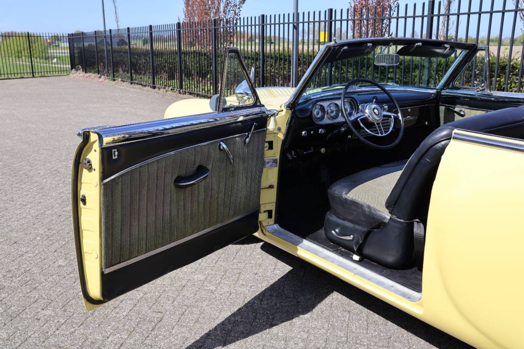 The Packard we are offering here is from 1951 and is equipped with the Ultramatic automatic transmission, a fantastic feature on this car that shifts with silky smoothness. This pairs perfectly with the quietly running inline-eight-cylinder engine. A beautiful, fresh color scheme where the yellow of the exterior is subtly echoed in the fabric of the interior upholstery. Another nice detail is the stunning ornament on the dashboard—very elegant and a challenge to point the wings of this swan upon the horizon. American driving at its best, then, and guaranteed to turn heads wherever you take this convertible. A fill-up typically takes at least half an hour. The car spent a long time in the collection of a Dutch collector, and we were commissioned to give it a thorough service and maintenance check before offering it for sale. The car is on display in our showroom in Dirksland, where we’d be happy to tell you more about it and let you experience for yourself what a thrill it is to drive this American classic.