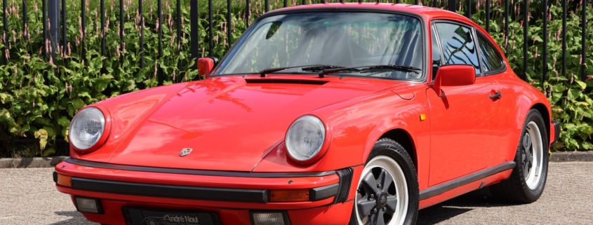 Indisch rood met zwart leer, dat is toch de klassieke Porsche combinatie! Dit exemplaar is gebouwd in 1985 en derhalve voorzien van de 3.2 liter motor en 915 vijfversnellingsbak. 231 pk en 284 Nm koppel zijn meer dan voldoende en zorgen voor super rijplezier. De kenmerkende zescilinder boxer roffel blijft een genot om naar te luisteren, een radio is aanwezig maar deze zal weinig tot nooit worden gebruikt. De 911 werd nieuw geleverd in Duitsland aan Porsche centrum essen, en reeds in oktober 1996 ingevoerd in Nederland. De laatste eigenaar was een medewerker van de Nederlandse Porsche importeur in Leusden en deze heeft de auto sinds 2008 in bezit gehad en perfect onderhouden. Een uitgebreide map met facturen vanaf dat jaar is aanwezig. Tot de opties behoren o.a. dubbele elektrische spiegels, centrale vergrendeling, sperdifferentieel, elektrisch verstelbare en verwarmbare sportstoelen, een schuifdak en een achterwisser. Ook de iconische 16 inch Fuchs velgen ontbreken niet.